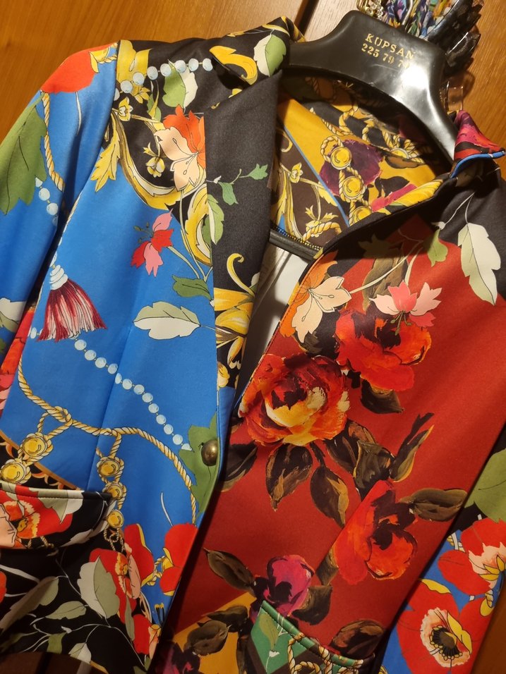 Kadınlar için zincir detaylı, çok renkli desenli ve ipek gibi yumuşak kumaşlı ceket. Notlu yaka, uzun kollu ve normal kesim midi boyda, bohem tarzda şık bir parça.