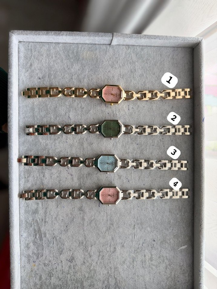 Zincir detaylı, çok renkli ve hafif tonlarda kadın saatleri. Üçüncü saatin açık mavi kadranı bulunuyor. ⌚