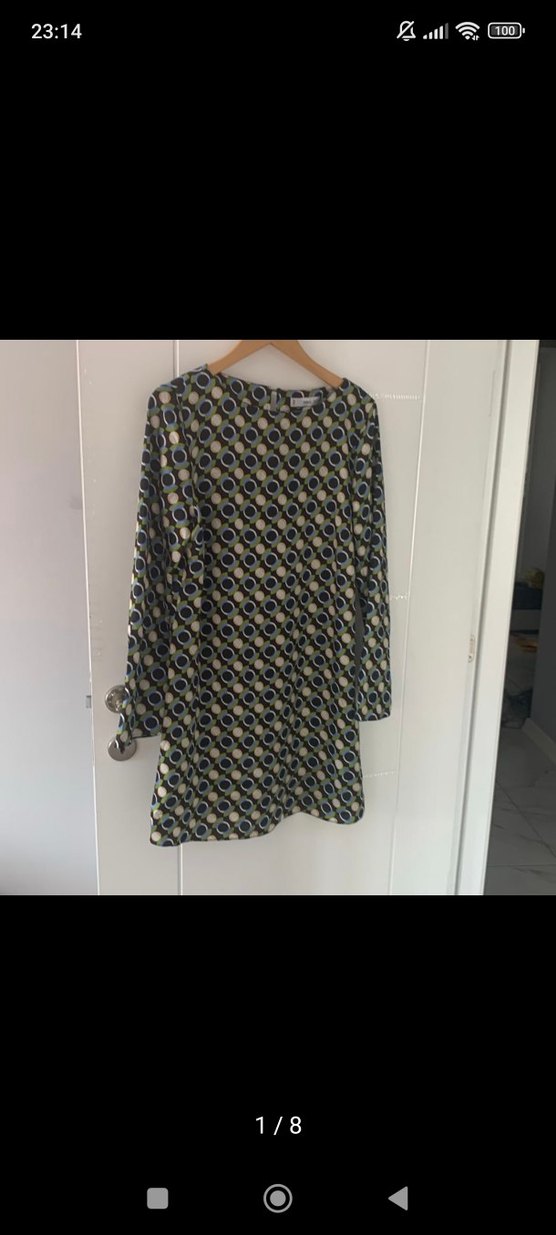 Kadın tunik, zincir detaylı, uzun kollu ve yuvarlak yaka. Sentetik kumaş, çok renkli batik desenli, rahat kesim ve midi boyda.