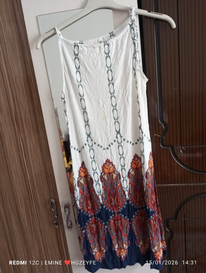 Zincir detaylı, askısız yakalı, bol kesim uzun elbise . Çok renkli batik desenli, yumuşak kumaştan, günlük bohem tarzı için uygundur.