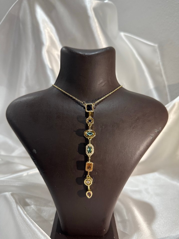 Zincir detaylı, çok renkli taşlarla süslenmiş uzun kolye. Yılan desenli ve çağdaş tarzda, günlük kullanıma uygun şık bir aksesuar.