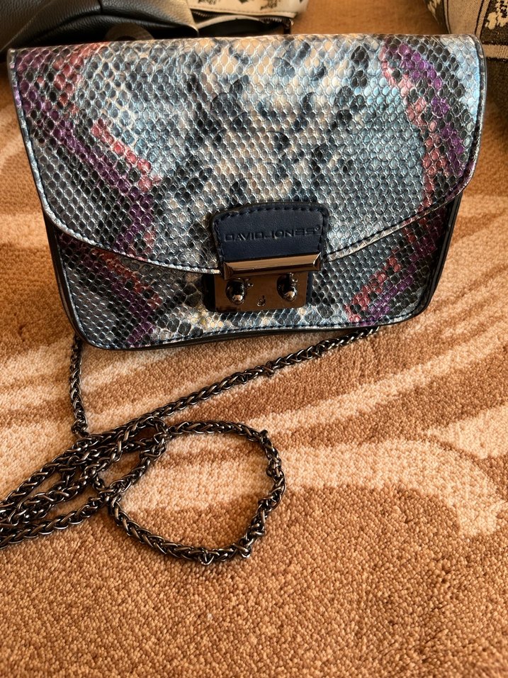 Kadın çantası, zincir detaylı yılan derisi desenli çok renkli koyu deri ile bohem ve retro Paris tarzını yansıtıyor.