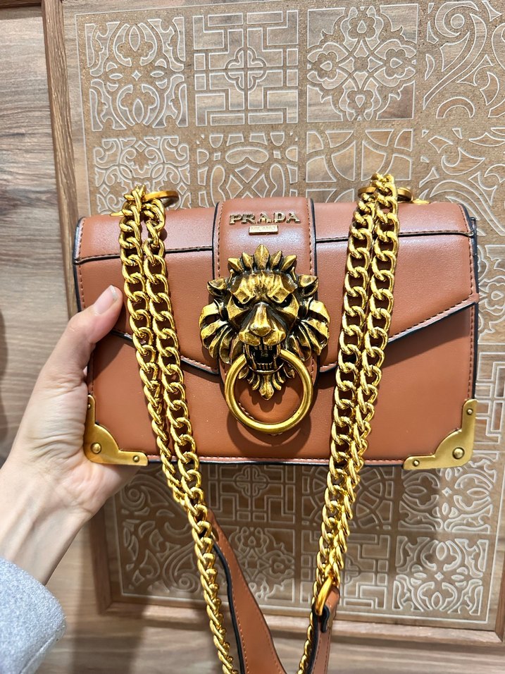 Taba rengi Çok şık Zincir detaylı deri kadın çanta, cesur aslan başı süslemeli. Parlak altın aksanlar ve yılan derisi desenli, modern klasik tasarım, günlük kullanıma uygun.