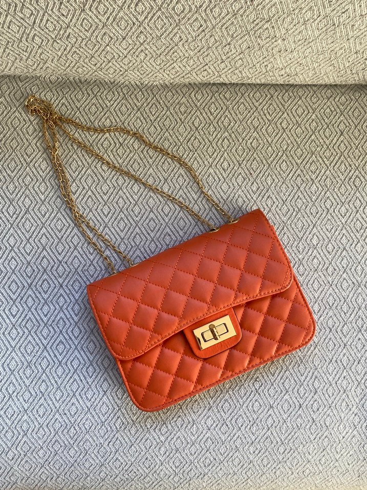Zincir detaylı, parlak yüzeyli kahverengi deri kadın çanta. Günlük kullanım için klasik Paris sokak stiliyle uyumlu, kareli desenli.