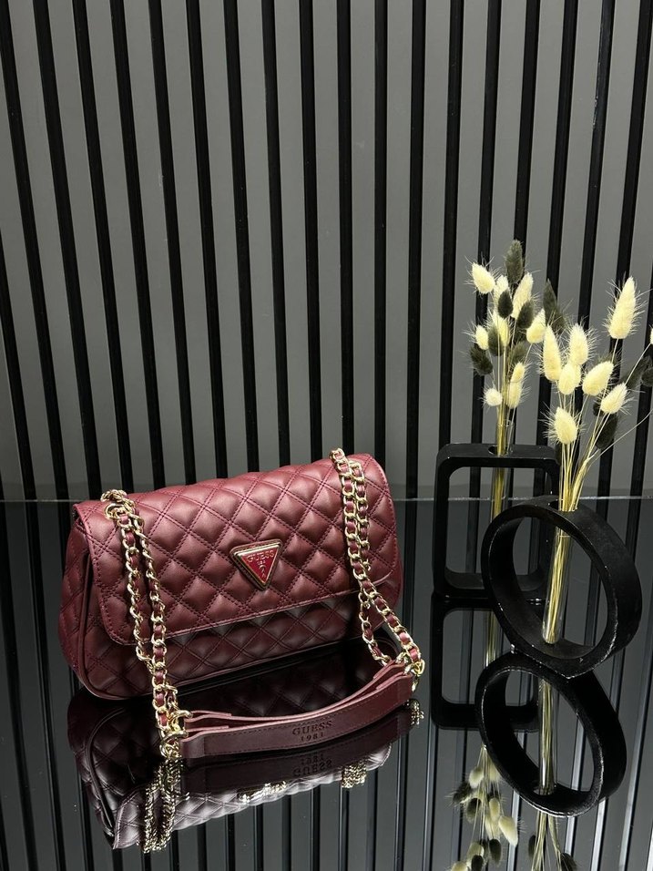 Bordo renkli, parlak deri çanta, çiçek desenli kapitone ve zincir detaylarıyla modern klasik Paris şıklığını yansıtıyor.