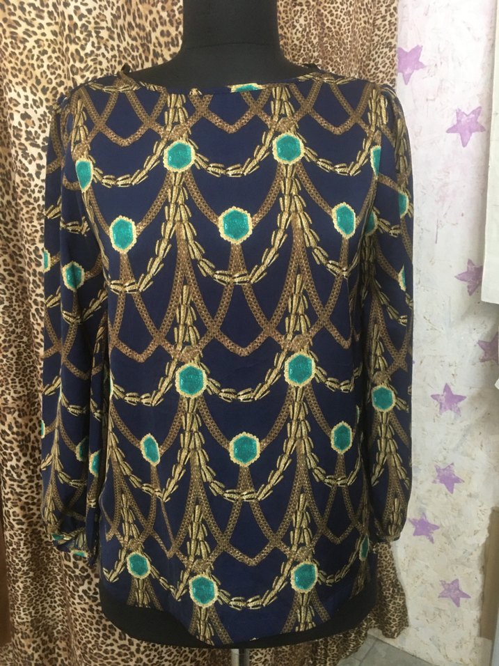 Lacivert renkli, zincir detaylı desenli, uzun kollu ve yuvarlak yakalı kadın bluz. Sentetik kumaştan, bol kesim, ofis kullanımı için uygun. Model arkadan düğmelidir 38/40 beden uyumlu