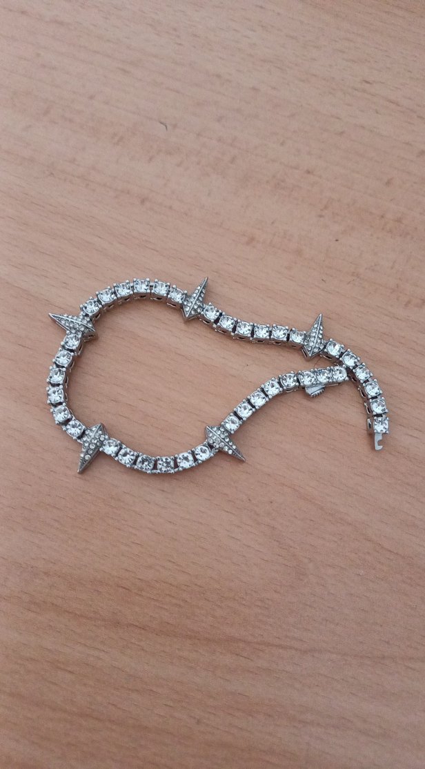 Gri ve beyaz renkte, zincir detaylı ve yılan desenli, sivri uçlu rock punk tarzı bileklik.