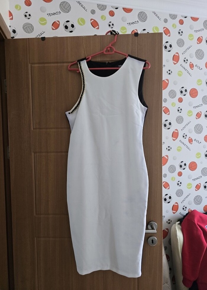 Gayet güzel şık bir elbise, sadece son fotoğrafta belirttiğim gibi belli belirsiz bir boyama lekesi var nasıl olduğunu bilmiyorum o yüzden fiyatı uygun yazdım. Ölçüleri fotoğrafta belirttim iade yoktur.