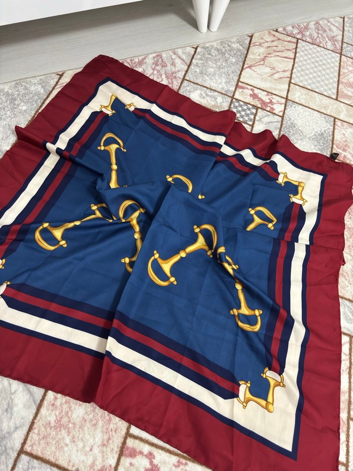 Bordo ve lacivert renklerde, zincir detaylı saten kadın fular. Klasik Paris tarzını yansıtan koyu renk paleti içerir.