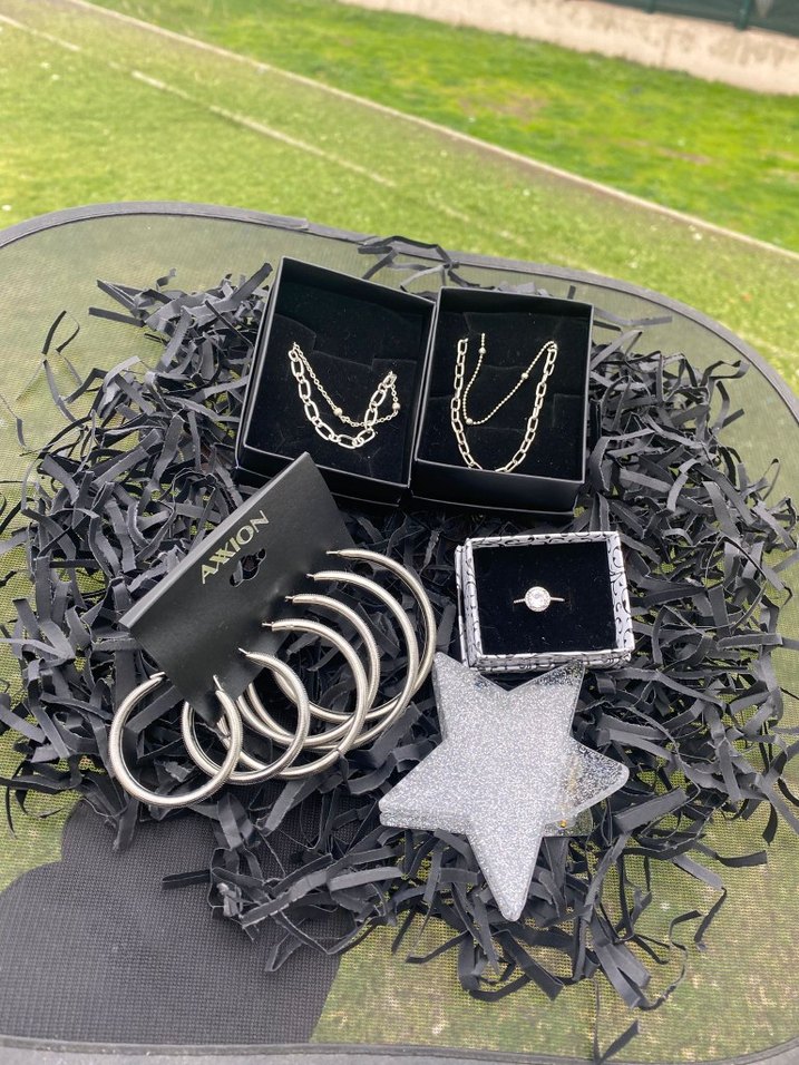 ikili gümüş rengi kolye ve aynı model ikili bileklik 6 lı küpe seti Gümüş rengi yüzük Yıldız şekilli toka