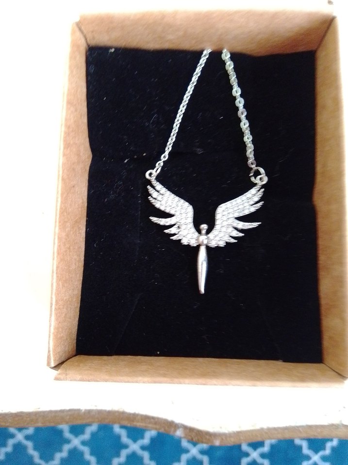 Parlak beyaz renkte, zincir detaylı ve kanatlı kolye. Gotik tarzda, rock punk havası veren midi uzunlukta günlük kullanıma uygun.