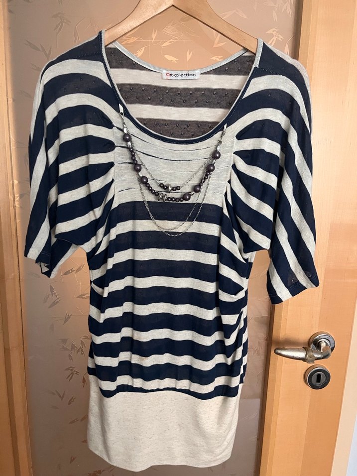 Gri çizgili tişörtü, kısa kollu ve yuvarlak yakalıdır. Zincir detaylarıyla dikkat çeker, rahat kesim ve midi boydadır. Günlük kullanıma uygundur.