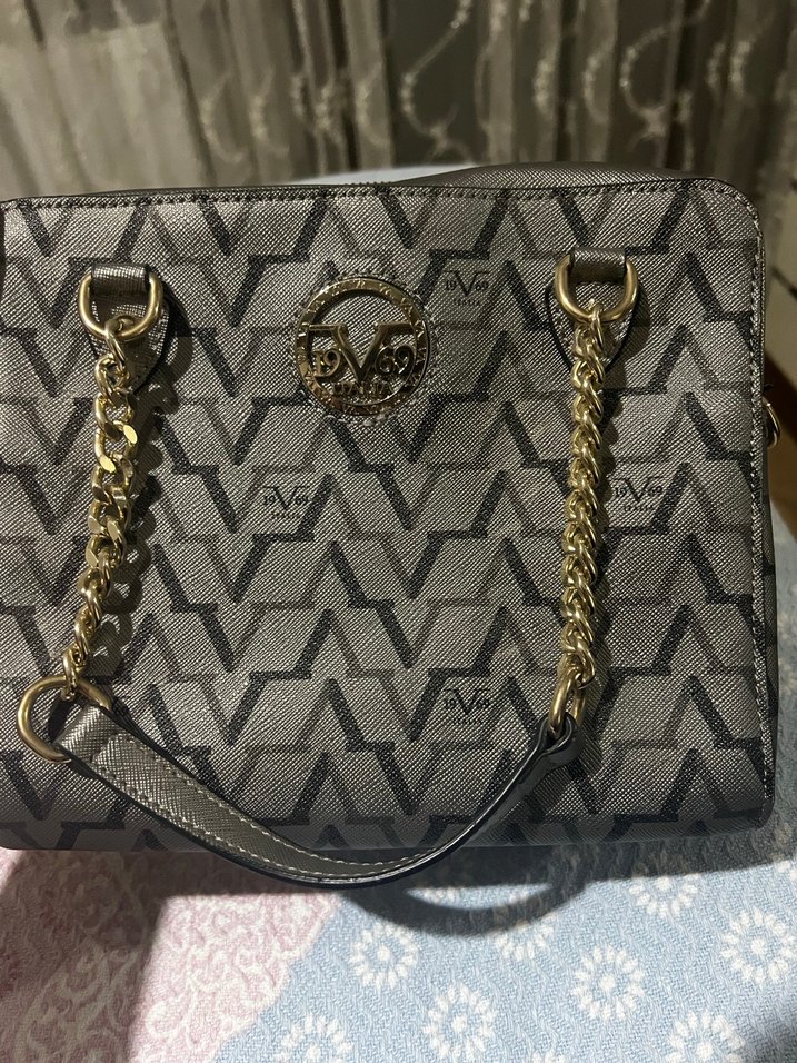 Zincir detaylı, gri baskılı deri kadın çantası, modern klasik tarzda, Paris şıklığını yansıtır, günlük kullanıma uygundur. Ürün hiç kullanılmadı hediye geldi