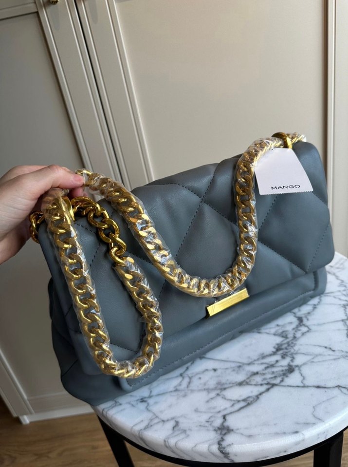 Gri deri çanta, modern klasik tasarıma sahip, zincir detaylı ve kapitone desenlidir. Günlük kullanıma uygun sıfır etiketli