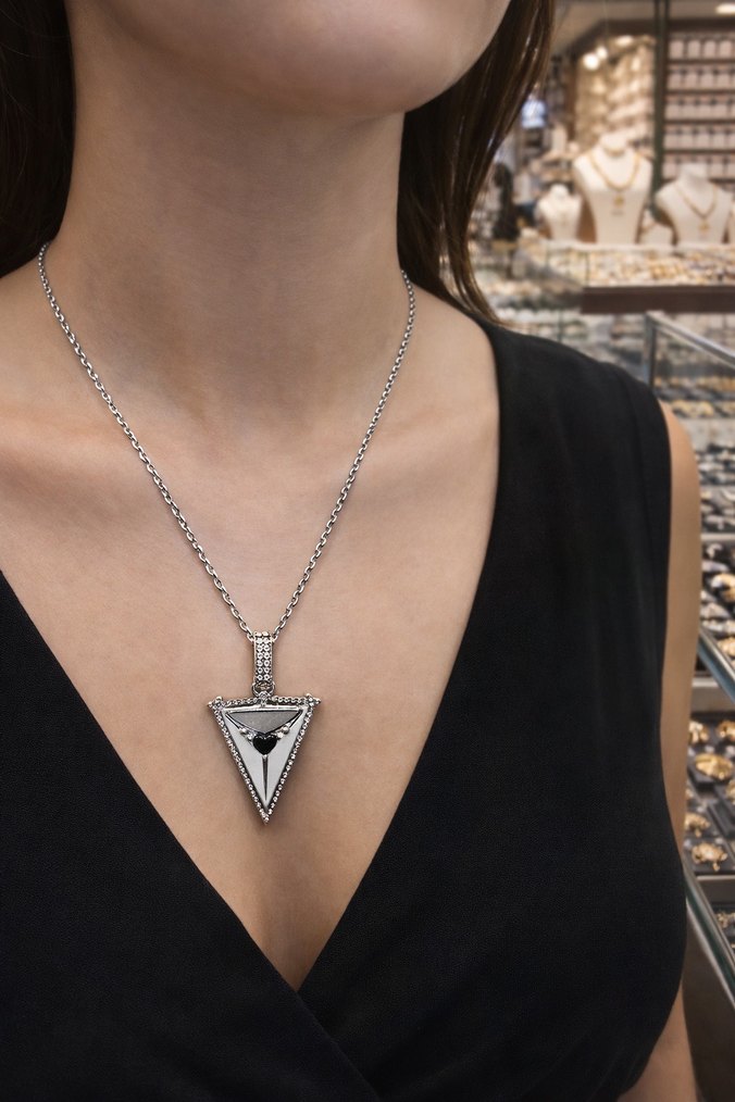 Gri renkte, zincir detaylı ve üçgen kolye ucu olan gotik tarzda midi uzunlukta kadın kolyesi.