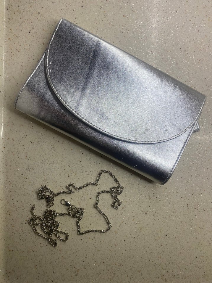 Zincir detaylı, gri gümüş deri kadın clutch çanta, minimalist tarzda, düğün ve sokak modasına uygun, desen içermeyen şık tasarım. Aşınmaları mevcut, delik deşiği yok.