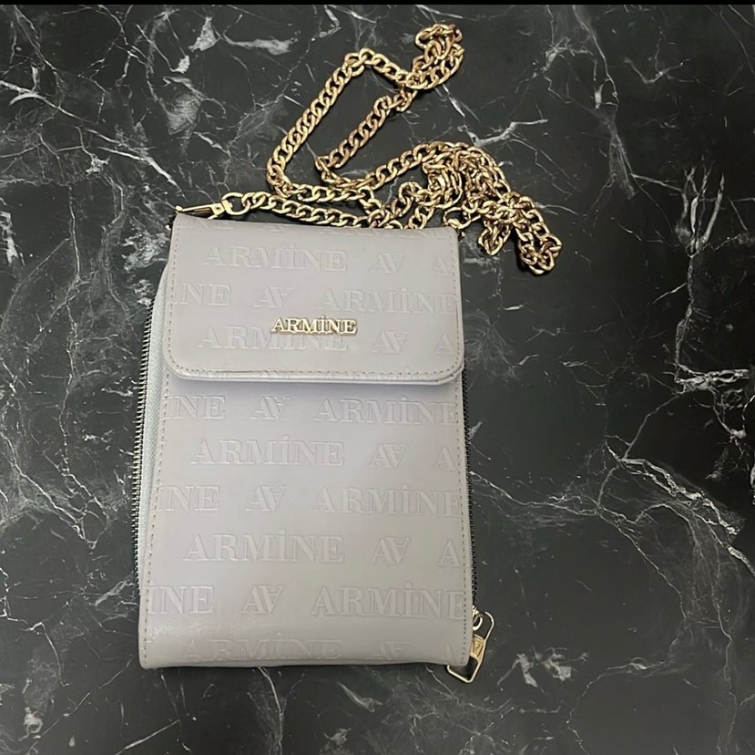 Gri renkte, zincir detaylı, baskılı desenli deri çapraz çanta. Üzerinde Armine yazısı bulunur, günlük kullanım için uygundur.