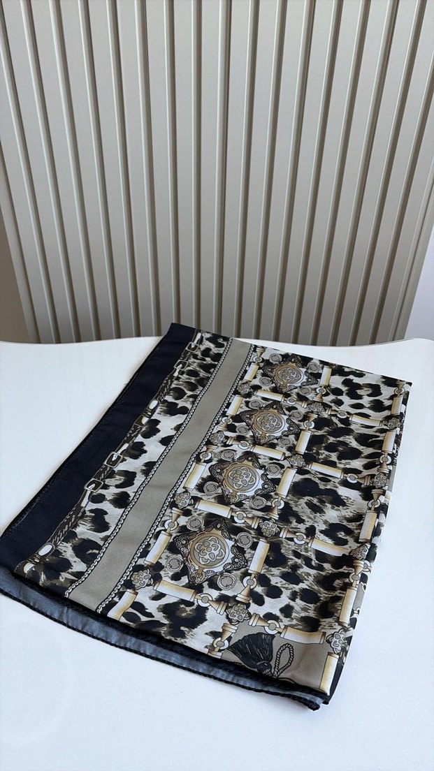 Gri sentetik kumaştan, zincir detaylı ve Paris esintili çağdaş tasarıma sahip klasik zarafet fular.