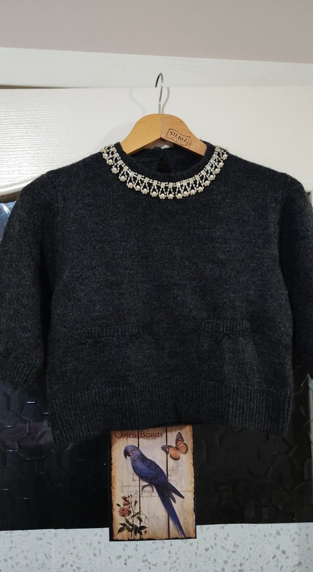 Gri renkte, zincir detaylı yuvarlak yaka, uzun kollu, bol kesim ve normal uzunlukta triko kazak.uzunluk 45cm kol arası 45cm kol boyu 33cm resimde görüldüğü gibidir