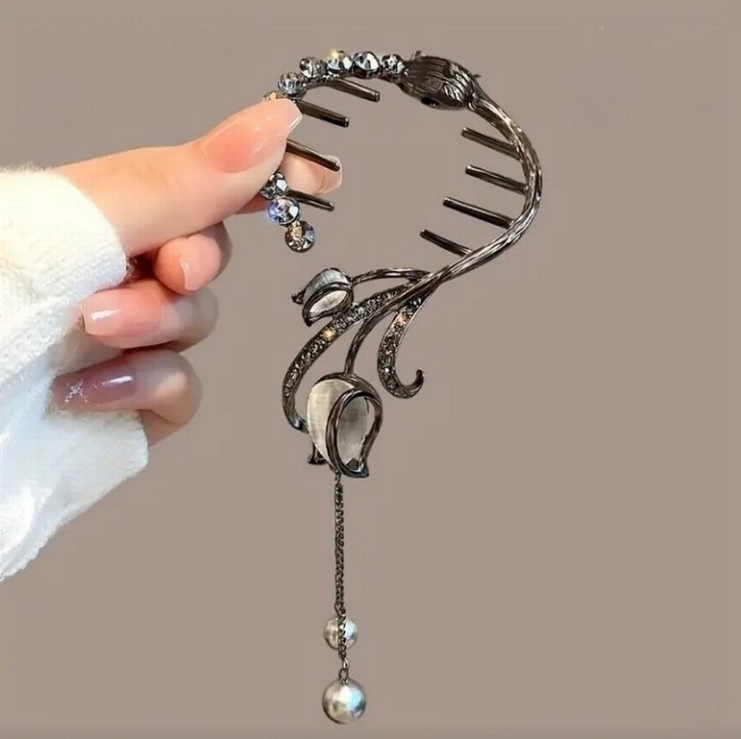 Yeni sıfır ürün YURTDIŞINDAN ALINDI Gri renkte, lale desenli ve zincir detaylı toka. Gotik ve avangard tarzda, günlük kullanıma uygun.