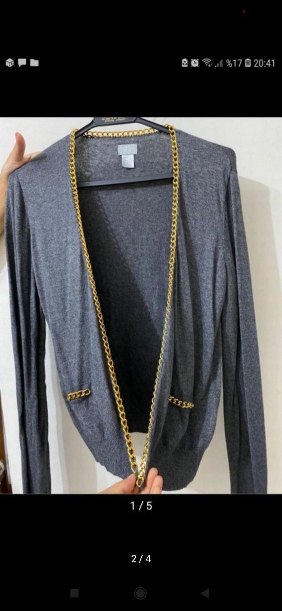 V yaka, uzun kollu, zincir detaylı gri triko hırka. Ofis ve günlük sokak stiline uygun, vücuda oturan kesim.