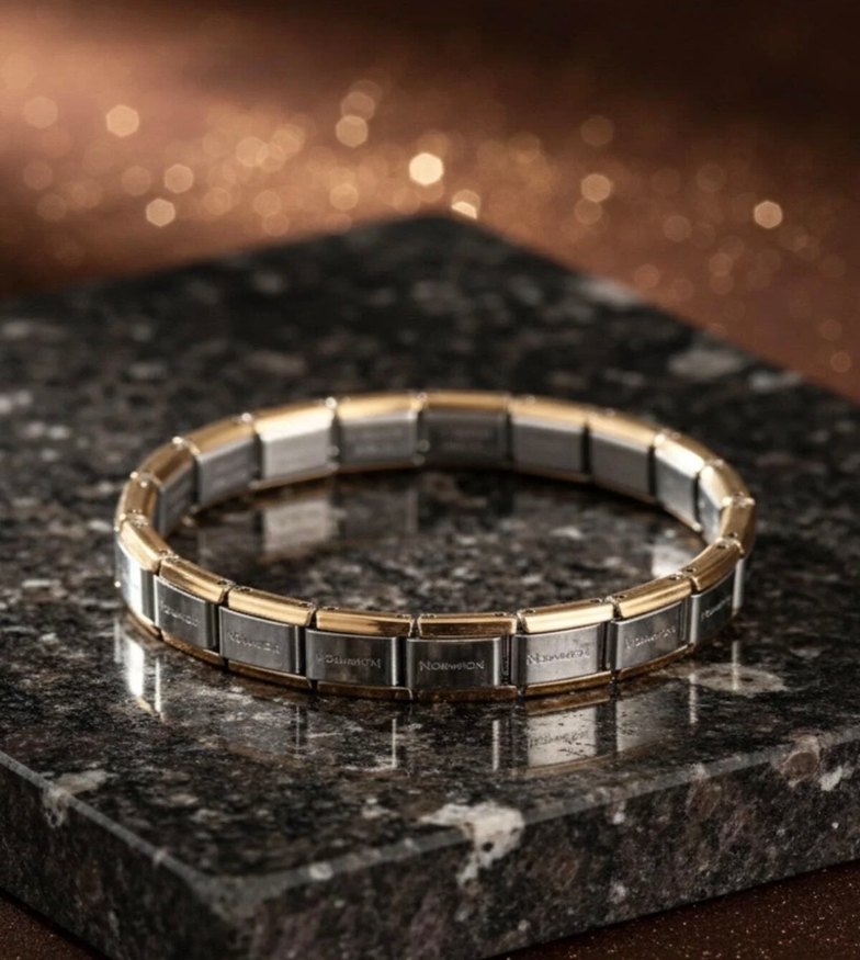 Nomination bileklik Parlak altın renkli, zincir detaylı kadın bileklik. Klasik ve zarif stil sunar, günlük kullanıma uygundur. Desensiz ve sokak stilinden esinlenmiştir. ✨