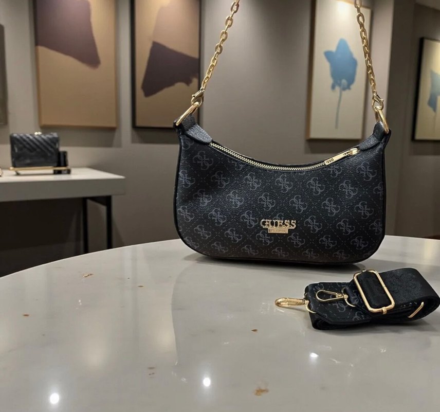 Guess markalı, baskılı desenli siyah deri çanta, zincir detaylı. Trendy günlük sokak stiline uygun, günlük kullanıma ideal.