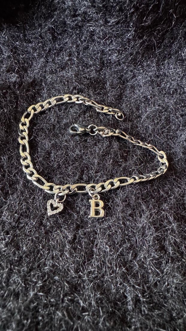 Gümüş renkli bileklik, zincir detaylı ve işlemeli kalp ile 'B' harfi figürlerine sahip. Parlak yüzeyi ve cesur, rahat sokak stili için uygun. ✨