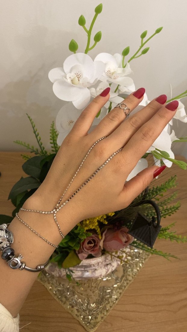 Gümüş renkte zincir detaylı kadın el zinciri kararma yapmaz.
