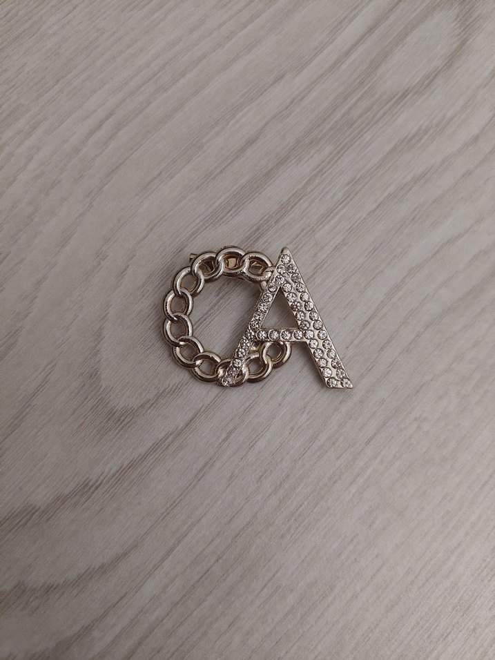 Zincir detaylı, A harfli broş. Parlak yüzeyiyle ofis kullanımı için uygun, bohem tarzda bir aksesuar.