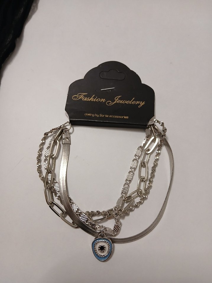 gümüş renginde, zincir detaylı bohem bileklik. Küçük nazar boncuğu içerir. Günlük kullanıma uygun şık tasarım. ✨