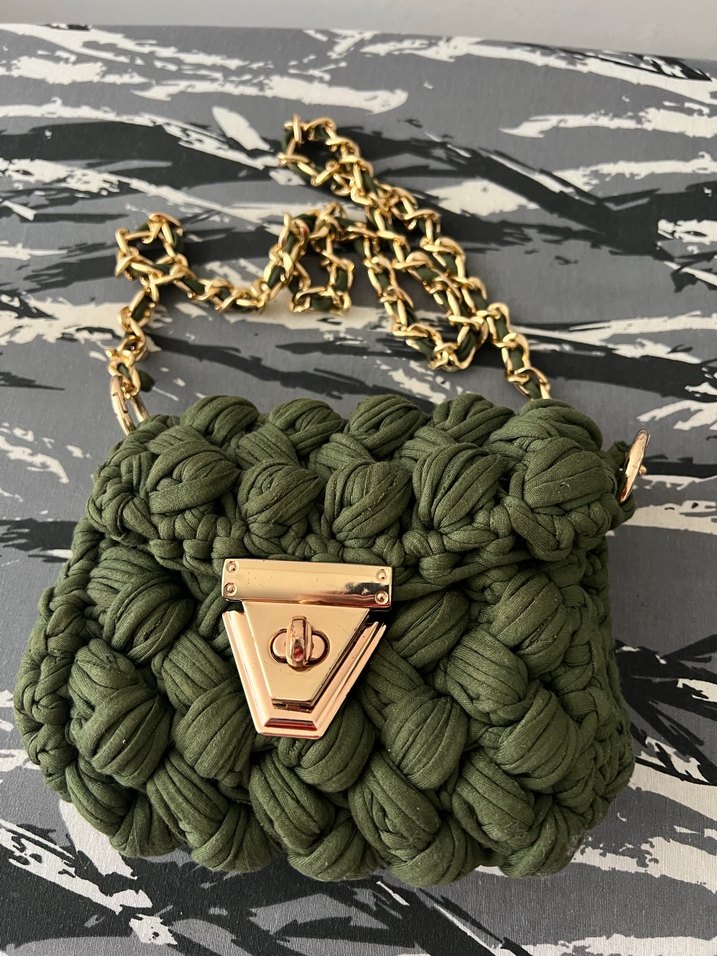 Haki renkli, kalın örme dokulu kadın çanta, altın renk zincir detayı ve üçgen kilit ile bohem tarzda, günlük kullanıma uygun kamuflaj desenli.