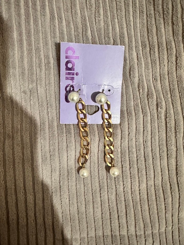 Zincir detaylı uzun altın küpeler, inci süslemeleriyle trendy ve günlük kullanıma uygun parlak bir görünüme sahiptir. ✨