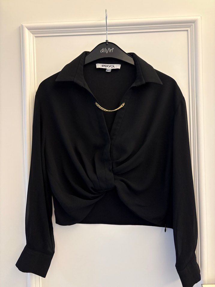 Siyah, zincir detaylı, yakalı ve uzun kollu bluz. Gevşek kesim ve ipeksi dokusu ile ofis için uygun, minimalist sokak stilinde. XS BEDEN SİYAH RENK. SORUNSUZ