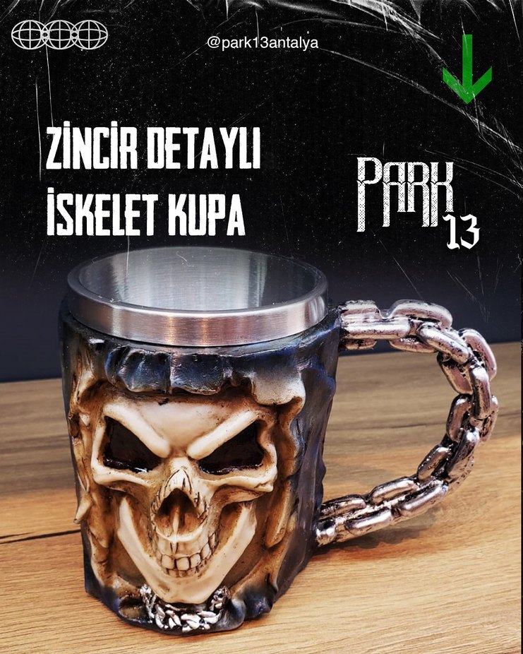 Kahverengi iskelet figürlü, zincir detaylı kulplu koyu renkli kupa. ☕