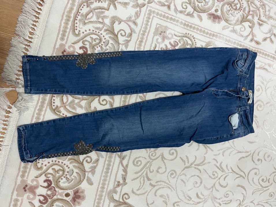 İşlemeli desenler ve zincir detaylı, fitted kesim koyu mavi denim kot pantolon. Midi boyu ve bohem tarzıyla günlük kullanıma uygun.