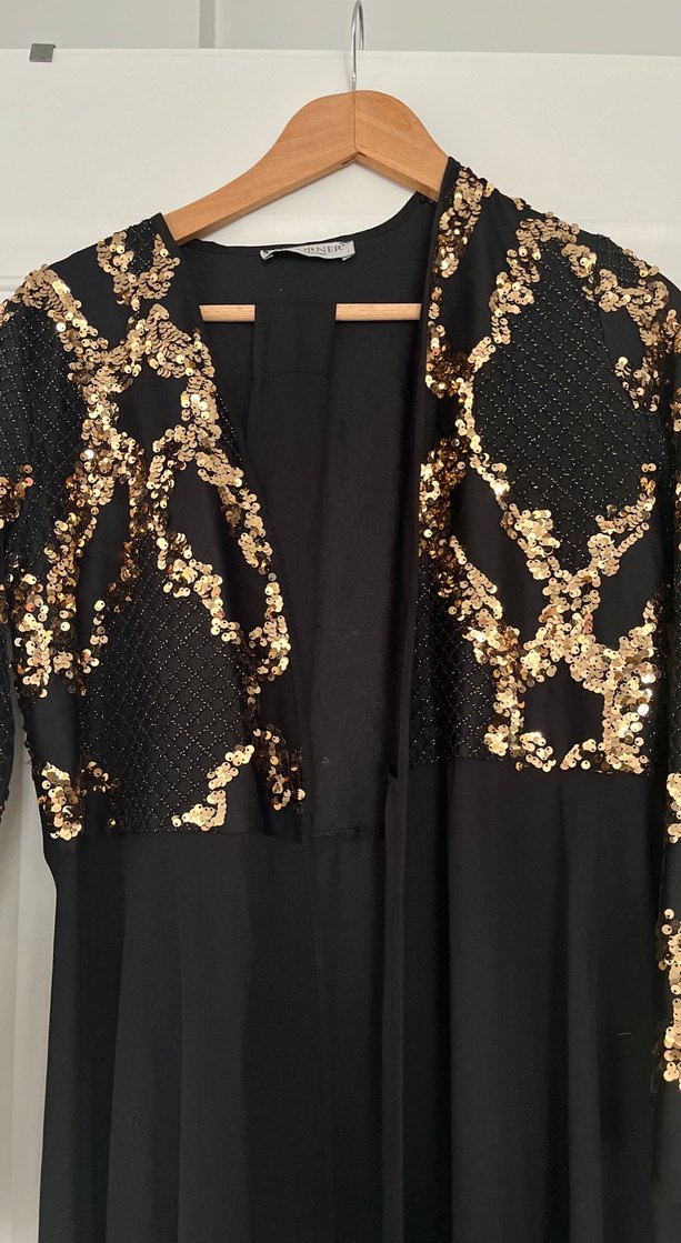 Uzun, bol kesim, V yaka ve uzun kollu bu abiye elbise, altın renkli işlemeler ve zincir detaylarıyla süslenmiştir. Parti için uygundur. ✨ Siyah payetli abaya 1 bedendir kemeri mevcuttur