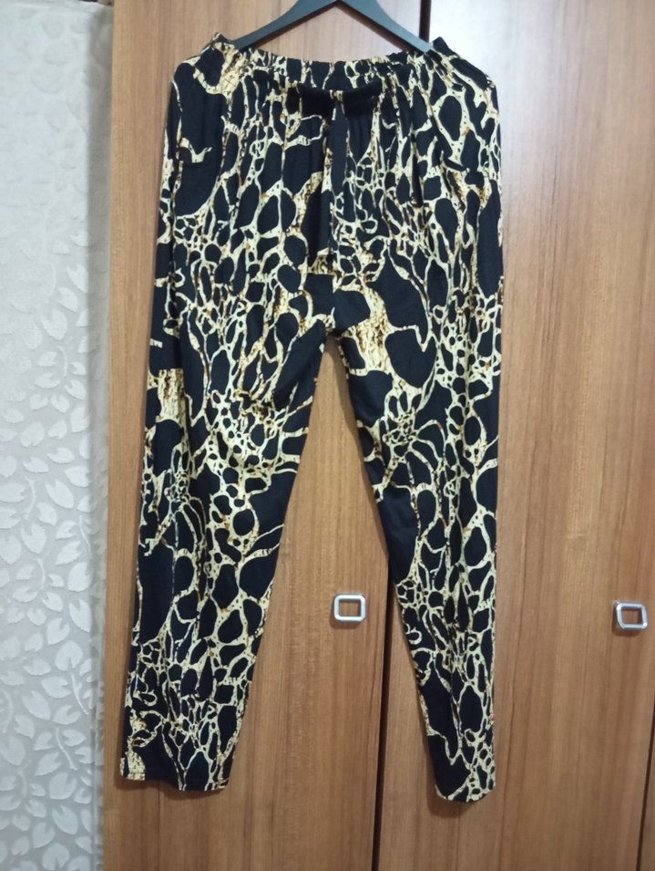 Kadınlar için uzun, bol kesim altın yılan desenli ve zincir detaylı sentetik kumaş pantolon. Trendy ve rahat kombinler için uygundur.