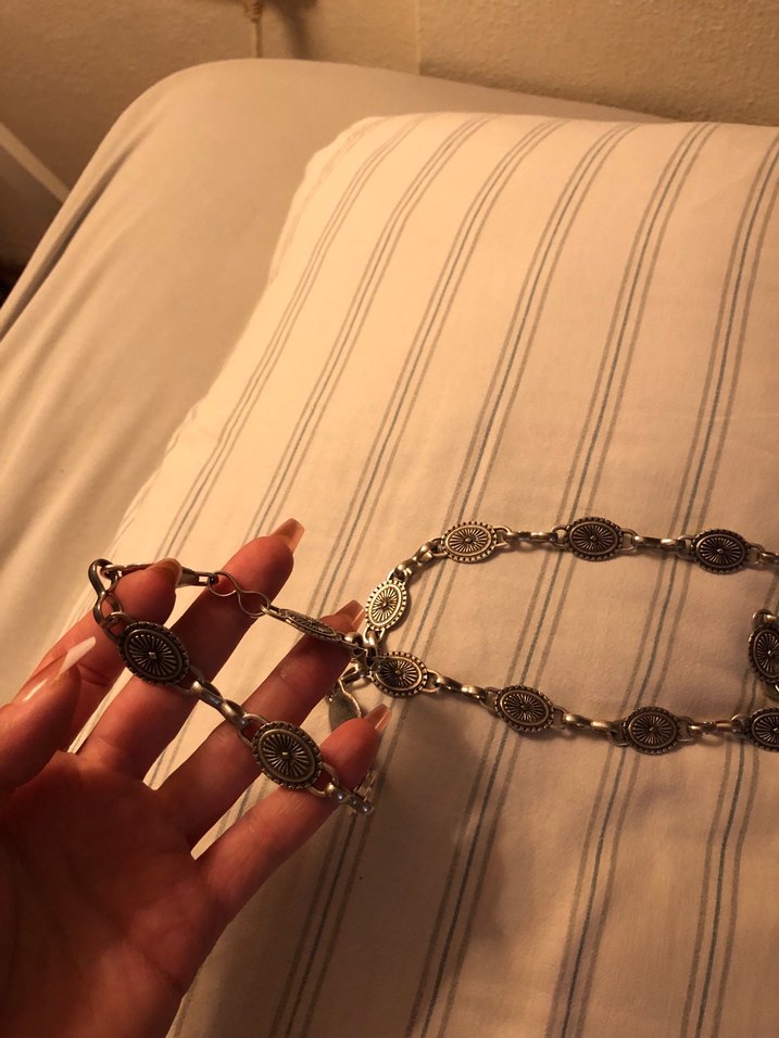 Vintage desenli zincir detaylı, günlük kullanıma uygun gümüş renkli kadın bel zinciri.