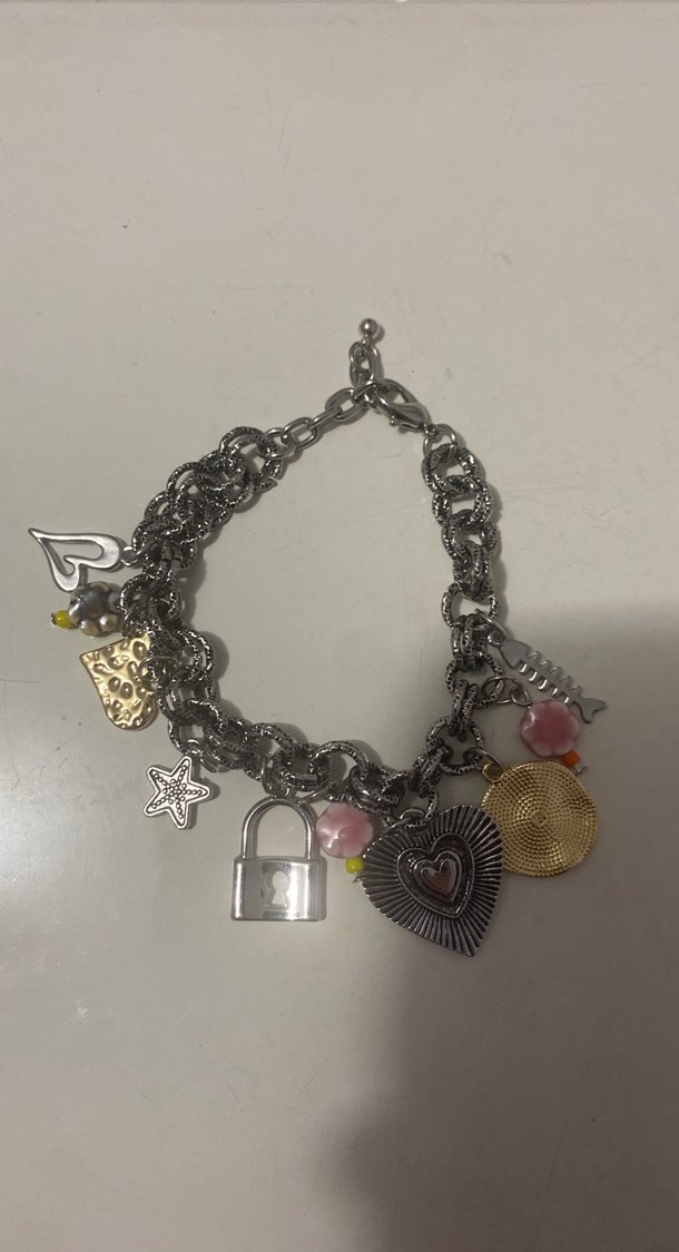 Bu kadın bileklik, kalpler, kilit ve çiçek detayları gibi çeşitli figürlerle zincir detaylıdır. Günlük kullanıma uygun bohem ve retro tarzda.