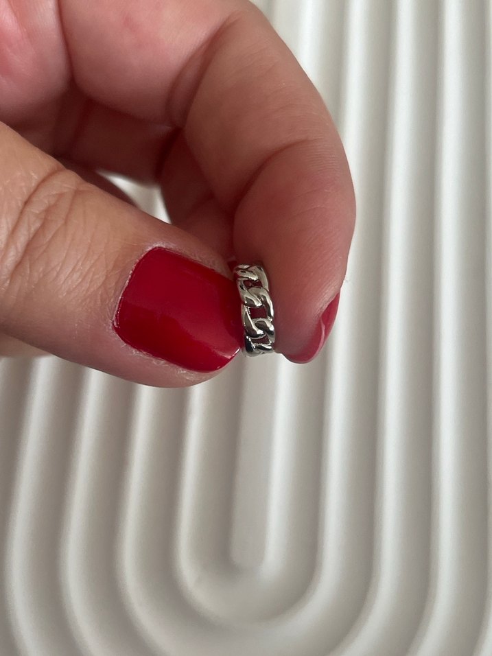 Parlak zincir detaylı kadın yüzüğü, minimalist ve sade tarzda, günlük kullanıma uygun ve desensizdir. Kontr-kültür stilini tamamlar.