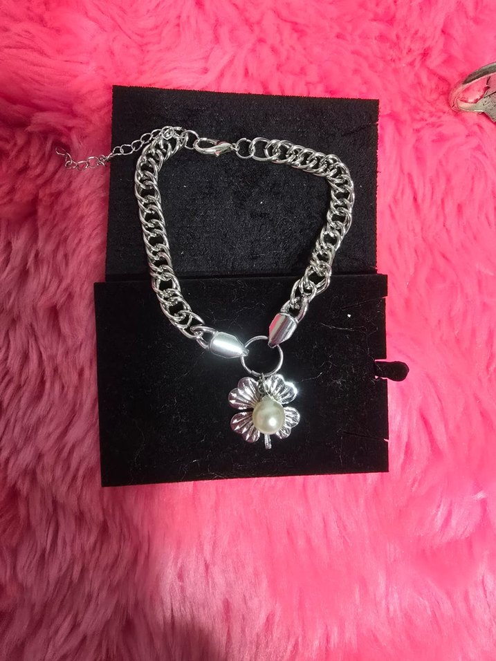 Kadınlar için zincir detaylı el zinciri, çiçek ve inci süslemeli, günlük kullanıma uygun gösterişli bir tasarım.