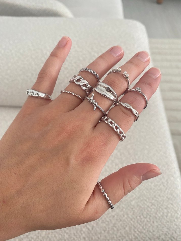 Bohem tarzda, zincir detaylı minimal desenli kadın yüzük seti. Gri beyaz tonlarda, günlük kullanıma uygun.