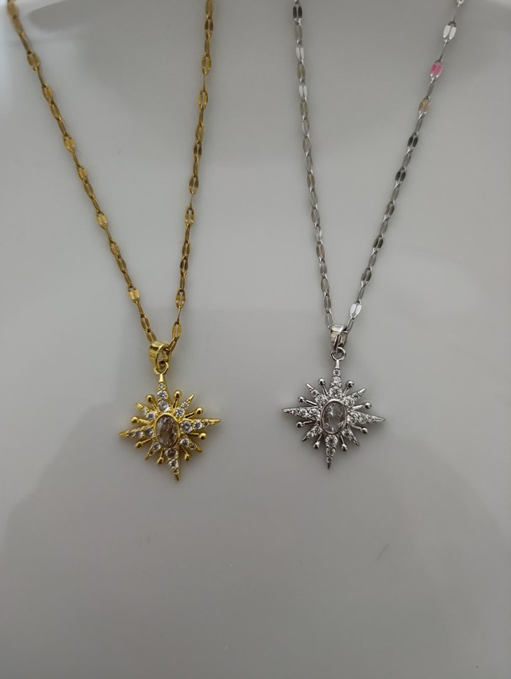 Altın ve gümüş renklerde, zincir detaylı, nakış işlemeli yıldız şeklinde kolye ucu ile kadın kolye. Günlük kullanıma uygun, minimalist ve bohem tarzda. ✨