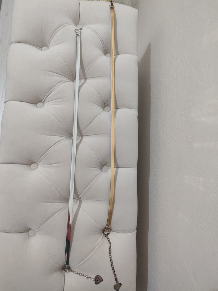 Klasik ve zarif görünüme uygun, altın ve gri metal zincir detaylı çağdaş kadın kemerleri.