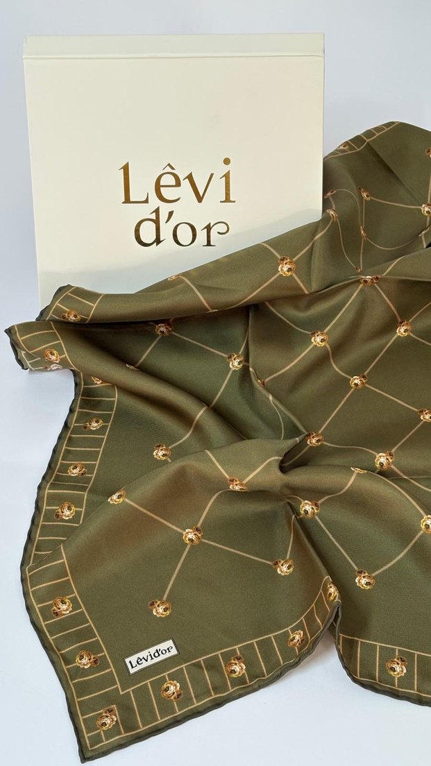 Haki renkli, parlak zincir desenli saten fular. Klasik Paris tarzını yansıtan Levi d'or ve Levidor markalı kadın fuları.