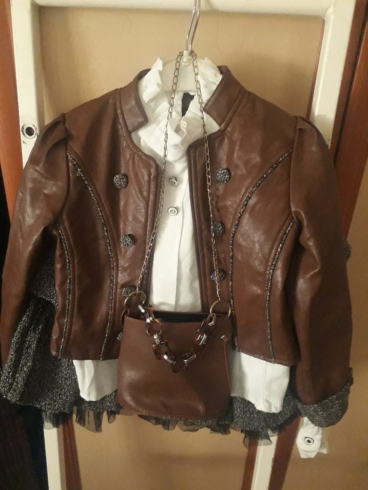 Kahverengi deri, zincir detaylı, normal midi boyda, strappy kollu, biker tarzı, fitted kesim ceket.