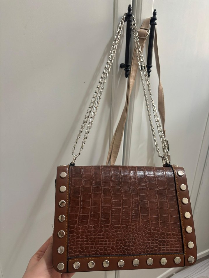 Parlak yılan desenli kahverengi deri çanta, zincir detaylı ve kenarlarında gümüş renkli çiviler bulunur. Modern klasik tarzda.iki canta birden verilecektir