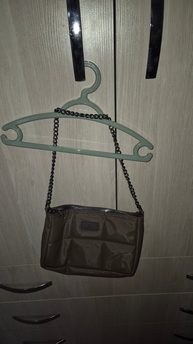 Kahverengi deri kadın çanta, zincir detaylı ve desen içermeyen minimalist tasarıma sahiptir, günlük kullanıma uygundur.