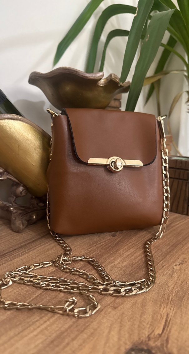 Zincir detaylı, parlak kahverengi deri kadın çantası, modern klasik tarzda, günlük kullanıma uygun.